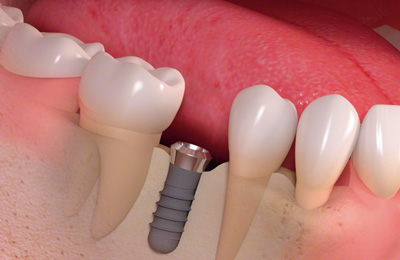 Einsetzen des Zahnimplantates: Das Einsetzen einer künstlichen Zahnwurzel wird normalerweise unter ärtlicher Betäubung durchgeführt. Der Zahnarzt schafft ein passendes "Bett" im Kieferknochen, in das das Implantat eingesetzt wird. Ein Provisorium auf dem Implantat ermöglicht, dass der Patient auch während der Einheilphase essen, sprechen und lachen kann.